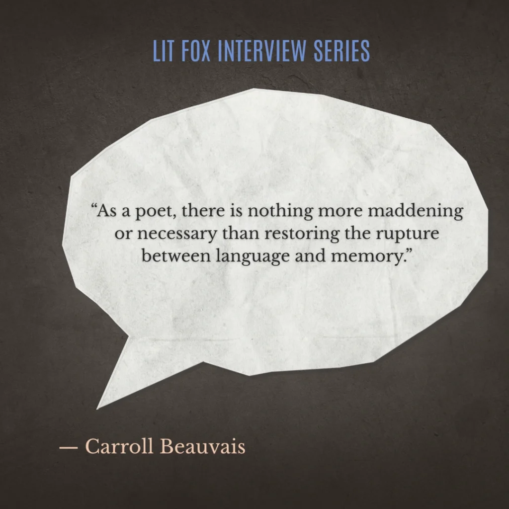 Carroll Beauvais is the author of Preverbal (Lit Fox Books, 2025) and her poems have appeared or are forthcoming in Prairie Schooner, Mid-American Review, Wisconsin Review, Delta Poetry Review, NELLE, and elsewhere. She was a finalist for the Brittingham and Felix Pollack Poetry Prizes from the University of Wisconsin Press and a semi-finalist for Alice James Books’ Beatrice Hawley Prize and the 2024 Airlie Prize. Her writing has received support from Bread Loaf Writers’ Conference and she holds a MFA from Syracuse University.